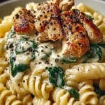 Eine cremige und herzhafte Hähnchen-Pasta mit frischem Spinat und Frischkäse. Perfekt für ein schnelles und befriedigendes Abendessen unter der Woche.