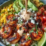 Eine erfrischende und nahrhafte gegrillte Garnelen-Bowl, perfekt für eine leichte Mahlzeit. Bunte Aromen treffen auf zarte Garnelen und knackiges Gemüse.