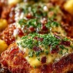 Für eine vegetarische Variante kannst du die Hühnerbrust einfach durch dicke Scheiben Halloumi oder feste Tofuwürfel ersetzen. Diese werden ebenfalls in Ei und Paniermehl gewendet und anschließend gebacken oder gebraten. Die käsige Textur von Halloumi oder die fleischähnliche Konsistenz von Tofu harmonieren wunderbar mit der knusprigen Panade und dem geschmolzenen Käse.